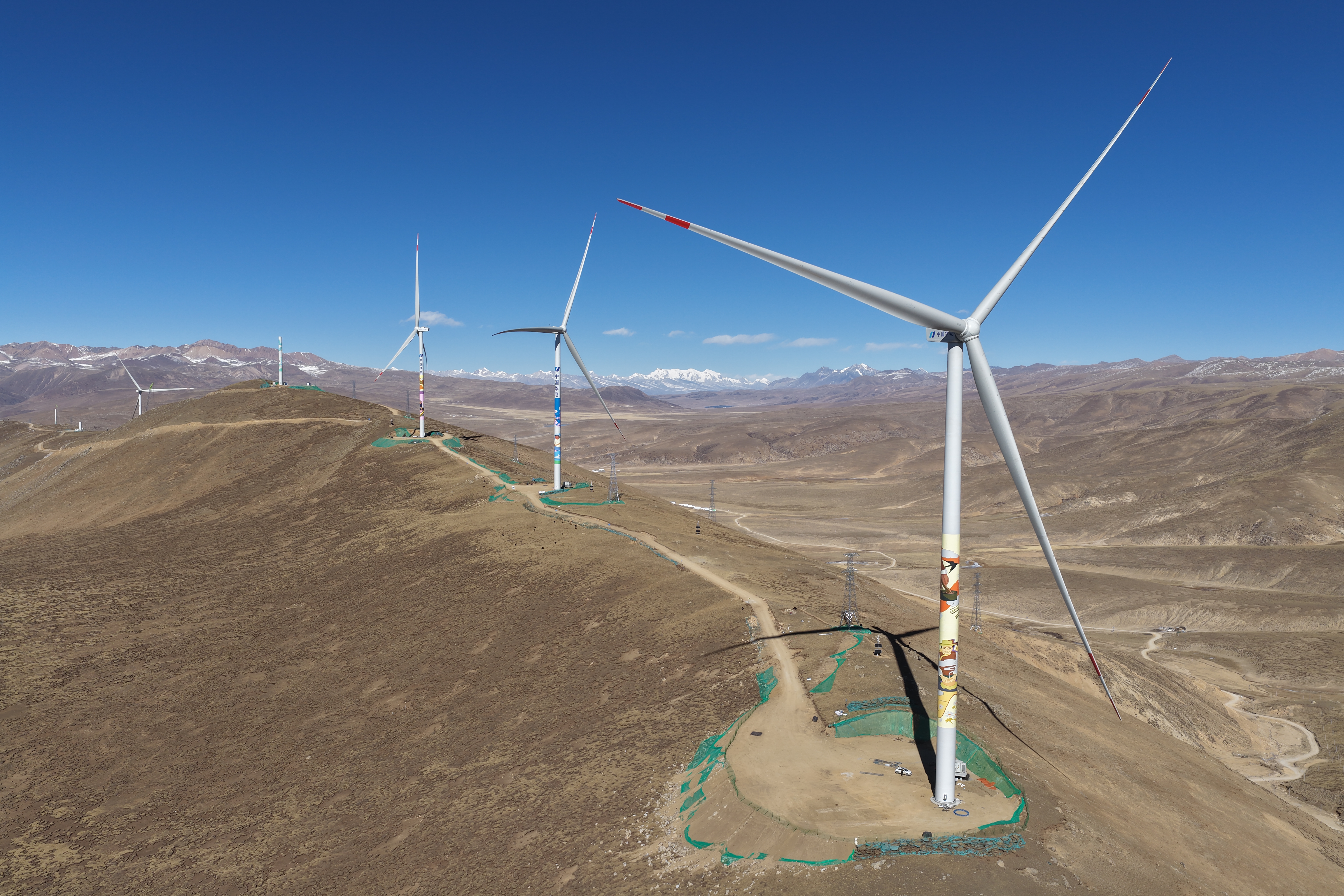 在建設過程中,項目團隊通過添加專用防凍劑、啟用智能溫控系統,攻克大體積混凝土連續澆筑技術難關;創新采用單葉片與整體葉片結合吊裝工藝,依托全景監控與無人機智能巡航系統,實現長97.3米、機艙高118米風機部件在復雜氣候條件下的毫米級精準吊裝。同時,項目團隊精準預判風力數據,動態調整作業窗口期,最大限度降低惡劣天氣對施工進度的影響;并網調試階段,結合西藏電網特點優化控制策略,依托構網型儲能平抑出力波動,保障機組穩定并網。